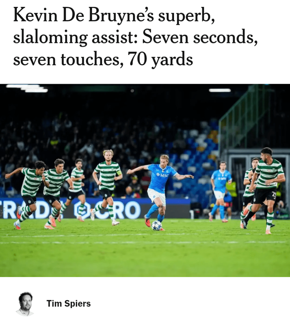 Questo articolo di Tim Spiers (da The Athletic) racconta di un momento magico, nella UEFA Champions League 2025/26. La magia riguarda Kevin De Bruyne il quale, a 34 anni, ha già messo a segno il miglior assist della stagione, se non uno dei più grandi mai visti nella competizione.