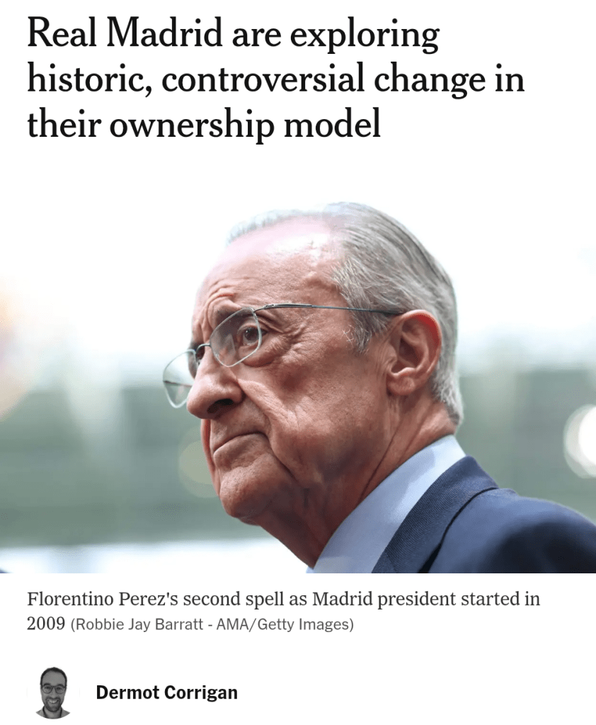 Per la prima volta dalla sua fondazione nel 1902, il club, tradizionalmente di proprietà dei suoi membri (socios), potrebbe presto aprire le porte a investitori esterni. A guidare questa potenziale rivoluzione è il presidente di lunga data del club, Florentino Perez.