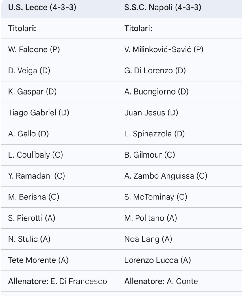 Le battaglie chiave si giocheranno a centrocampo, dove la potenza fisica di McTominay e Anguissa cercherà di scardinare il blocco difensivo del Lecce e sulle fasce, dove la spinta di Politano e Spinazzola sarà l’arma principale per creare occasioni da gol.