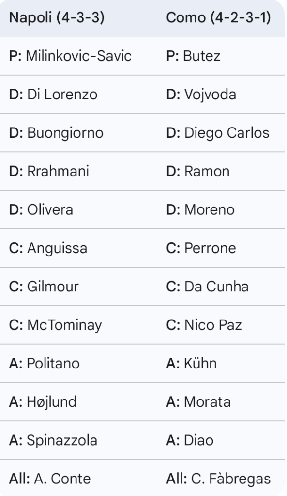 In conclusione, la sfida del Maradona è un test di maturità per il progetto di Fàbregas e un test di resilienza per la macchina di Conte. Le assenze in casa partenopea aprono a uno scenario in cui l’idealismo e la qualità tecnica del Como potrebbero avere la meglio sulla forza d’urto di un gigante ferito. Se i lariani giocheranno con il consueto coraggio ma senza ingenuità, hanno la concreta possibilità di creare la sorpresa. Se il Napoli, invece, dimostrerà che l’organizzazione e l’intensità possono sopperire anche all’assenza dei migliori talenti, porterà a casa una vittoria da grande squadra.