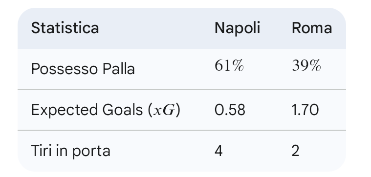 L’analisi statistica rivela un match dai due volti. Il Napoli ha dominato il possesso palla (61\%) e il numero di tiri (11 contro 9), ma la Roma è stata chirurgica nelle occasioni create.